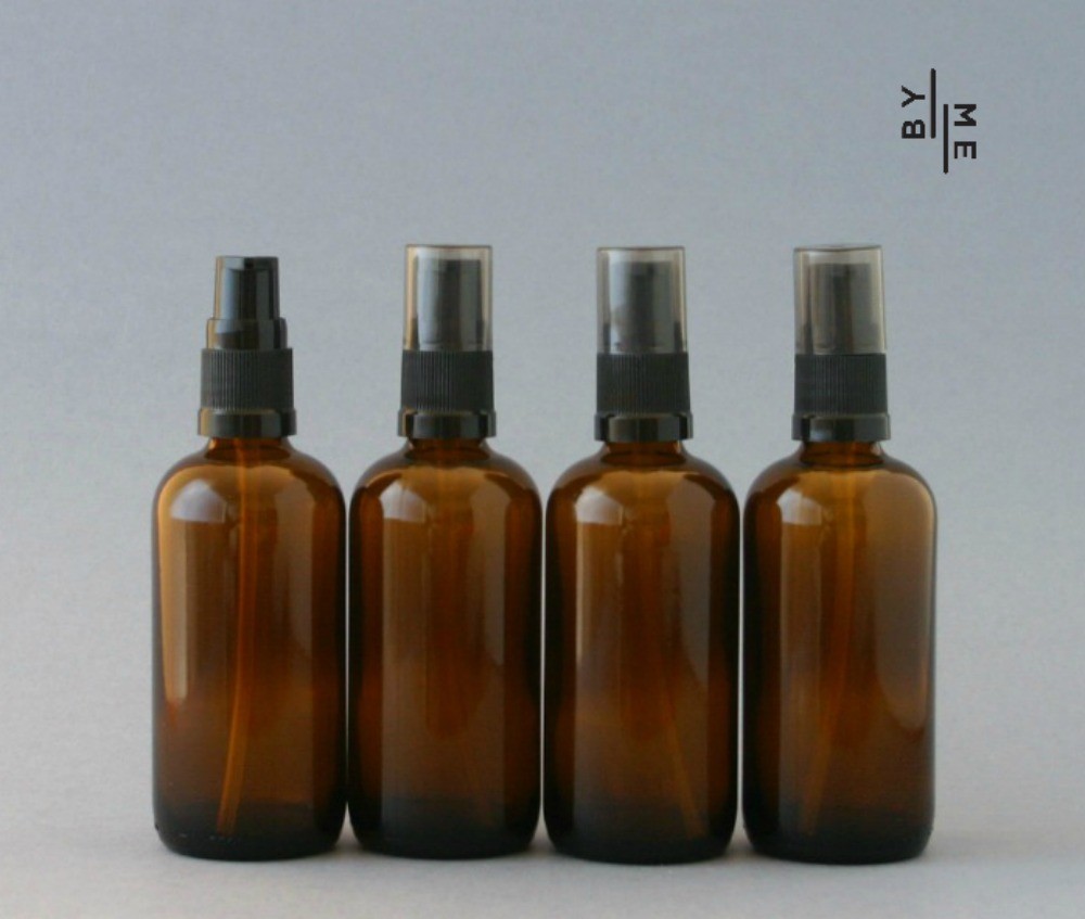This listing includes four 100ml amber glass bottles with lotion pump dispensers.