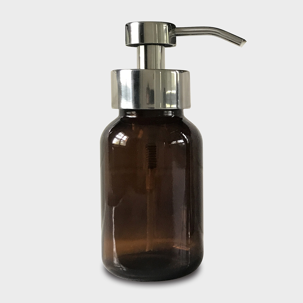 - amber pharmaceutical glass bottle with brushed stainless steel foaming soap dispenser