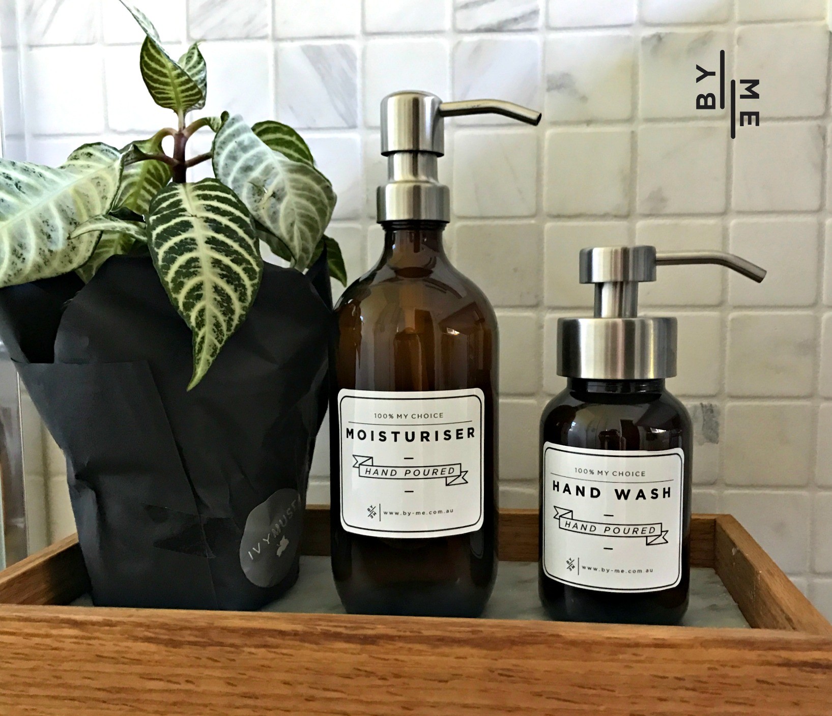 These beautiful apothecary style amber glass pump bottles make a classic pairing in the bathroom, laundry or kitchen bench.